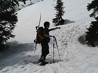 イキナリ腕つきだして、ジッとしとるつう図は、山の中でもこっぱずかしい。 |