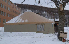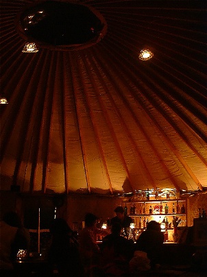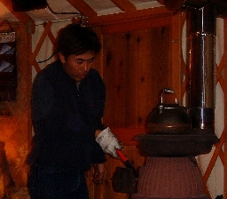 アヤしすぎる。和みすぎる。 ちがぁーう。モンゴルの草原なんかであっちの遊牧民が住んでる奴。あれだよあれ。 煌煌と輝くナイターを背に、外にはスワローテールの板が3本立てかけてある。ますます怪しい。 おぉ、ここにチョー和み空間が出現するわけだ。 ほーれ、あなたのDNAの奥底に潜んでいたモンゴロイドの血がじわじわと騒ぎ出するのにたいして時間はかからんであろうよ。 どうやら断熱対策もしっかりとされているらしく、コークスのストーブと何台かの石油ストーブで汗ばむほどなのだ。石炭係のおじさんがちゃんと面倒見てるしな。
