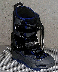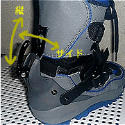 こいつの特徴はアキレス腱のところにある、このクイックリリースのよるヒンジシステムです(フローティングヒンジと呼ぶそうだ)。ここのレバーをロックすると足首のところで前後(縦)のフレックスを固定、サイドフレックス(サイド)はクイックリリースの所を支点にしてフリーのまま。 レバーをリリースすると、前後のフレックスも開放されて歩きやすいっちゅう仕組みです。 ここんとこ、クイックリリース自体はシマノの自転車のまんま。メカ好きのオトコゴコロをくすぐりまくるのである。 |